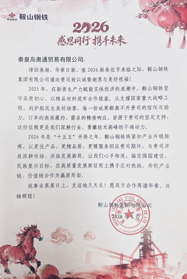 近日,我司秦皇島奧通貿(mào)易有限公司收到來自鞍山鋼鐵集團(tuán)有限公司的2026年新春賀函。這份來自國(guó)內(nèi)鋼鐵行業(yè)領(lǐng)軍企業(yè)的誠(chéng)摯祝福,既是對(duì)過去一年合作成果的高度認(rèn)可,也是對(duì)雙方未來共贏發(fā)展的深切期許。