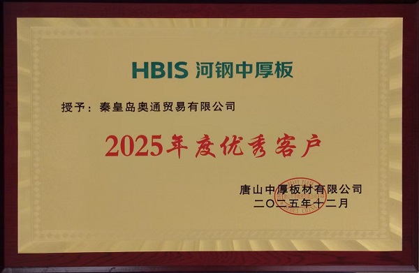 在河鋼集團中厚板板塊的年度評選中,秦皇島奧通貿易有限公司憑借卓越的服務能力、堅實的合作基礎以及良好的行業(yè)口碑,從眾多合作伙伴中脫穎而出,被授予“2025年度優(yōu)秀客戶”榮譽稱號。